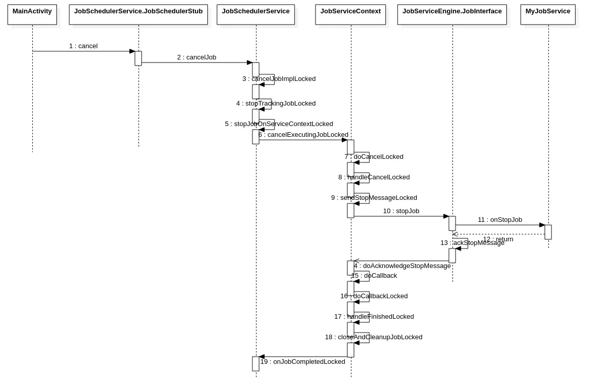看到这里总算是把Job的创建、执行、返回值处理等过程分析的差不多了,当然里面肯定还有很多细节部分需要去深究才行。这个时候我们去分析一下为什么onStopJob中的返回值作用。首先考虑一下当上层调用了cancelJob方法会出现在什么情况下: