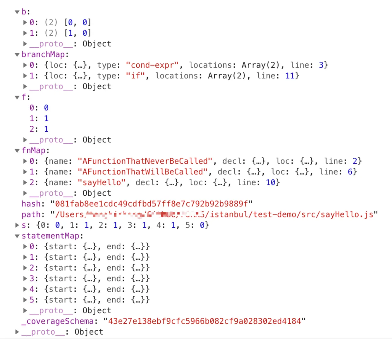 细心的朋友可能发现缺少了行覆盖率指标 Lines 计数器,其实行覆盖率是通过语句中的起始行和结束行之间语句的执行率计算得来的。如果再把 cov_1pwyfn0t92 这个对象展开来看里面的内容,那么经过装饰器“装饰”后的产出和解析结果就更加直观明了了: