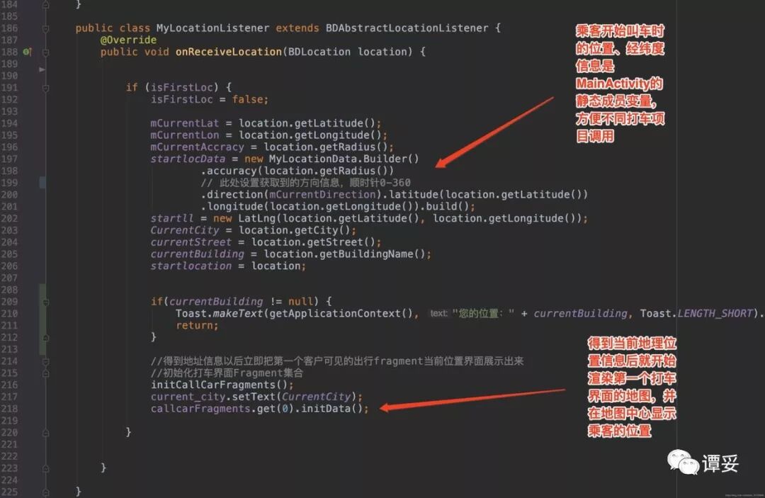 注意:乘客的位置信息、当前经纬度、当前街道名字、楼宇名字都是在MainAcitivity做为静态成员变量定义的,原因是在别的Acitivity或者类中,这些变量需要经常使用,直接调用 MainActivity.CurrentLocation就可以了,后面用到的所有当前位置,都是在MainActivity中 MyLocationListener 类得到的。