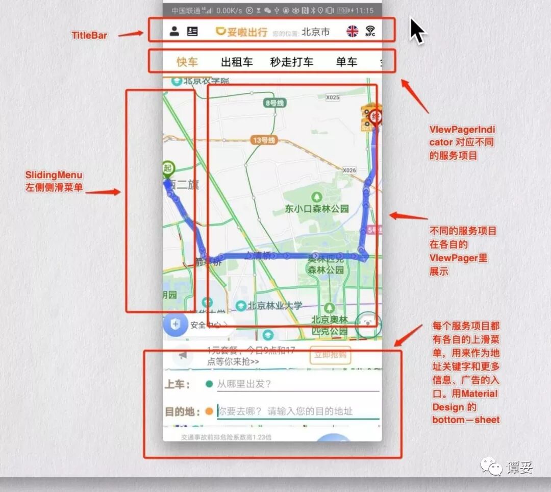 不同交通工具(快车,出租车,单车,公交车等等)对应的服务项目都嵌在TItleBar下边的 VIewpager里,一个服务项目对应一个独立的Fragmen文件,由其顶部的的VIewpagerIndicator滑动切换。服务项目的主要代码在com.tantuo.didicar 包下 TabFragment 文件夹里。
