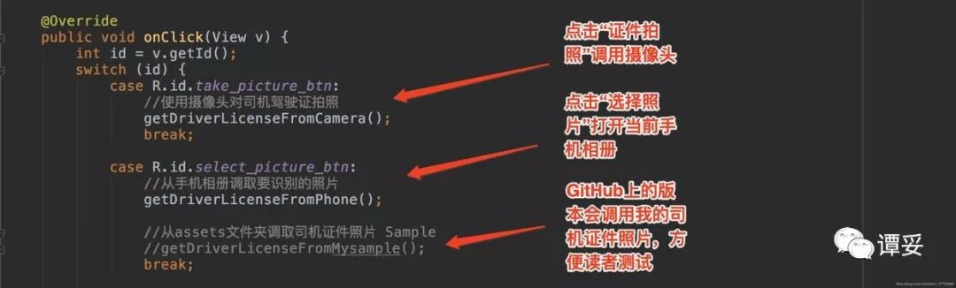 点击进入司机证件号码识别功能以后,可以选择对证件拍照,为了方便演示,这里是从手机相册选择刚刚拍的照片。同时为了方便读者测试这个功能,我把照片保存在了开发包的asset文件夹里面,这样读者下载我保存在GIthub上https://github.com/18601949127 的版本,点击选择司机证件以后调用的是我保存在assets 文件夹里的司机证件照片,也就是下面图片里的 getDriverLicenseFromMySample() 方法,可以立刻进行测试。想继续从手机相册读取的读者可以执行LicenseMainActivity 下的 LicenseMainActivity 方法。