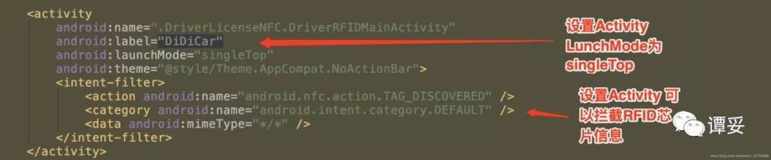 注意:某个Activity 要想能够在当前栈顶接收RFID芯片号码,必须在 Manifest.xml 文件中设置intent-filter 拦截TAGDISCOVERED的Action,这样这个Activity 才能捕获RFID标签信息。并且设置LunchMode 为SingleTop,确保再次捕获RFID标签信息(TAGDISCOVERED)的时候,始终由处于栈顶的这个Activity 来处理,而不是把他压入栈,调取新的DriverRFIDMainActivity作栈顶。有疑惑的同学可以看下 Activity 启动模式和栈管理的相关文章。