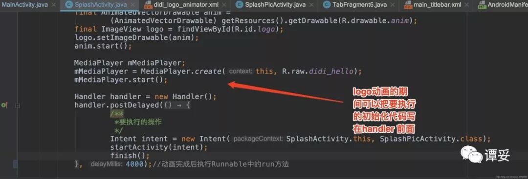 这几秒的时间里可以在下图的位置添加一些初始化代码,比如网络请求,得到后续Activity的素材,地理位置等等。