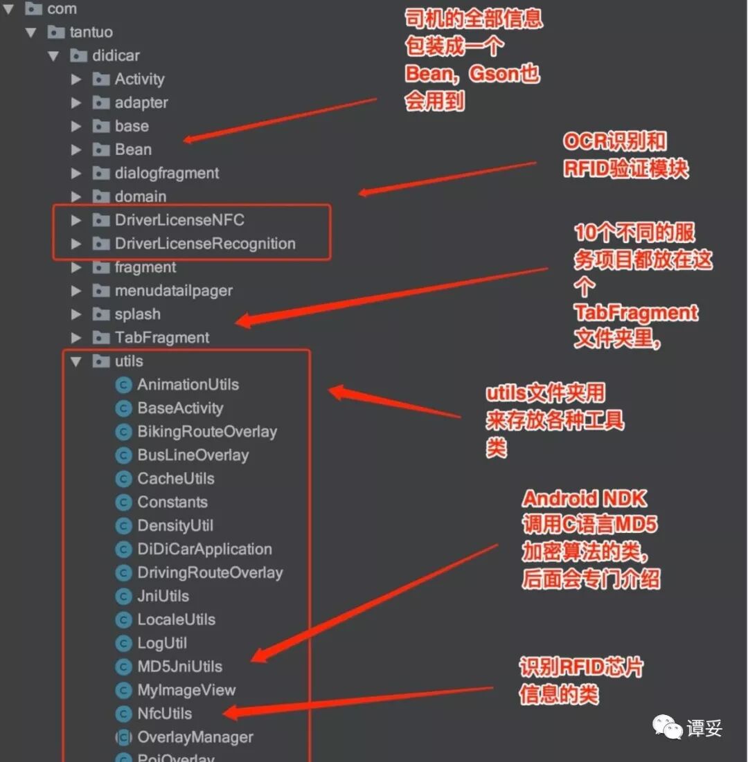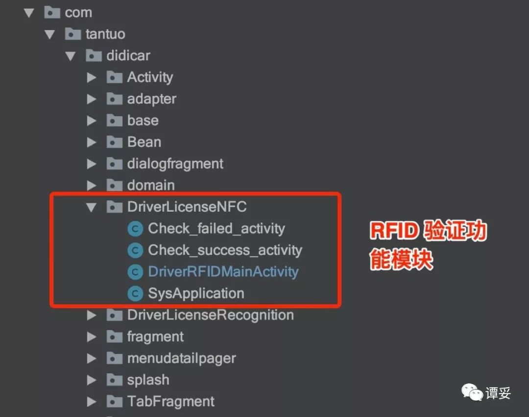 RIFD识别验证功能的主要代码在com.tantuo.didicar 包下的DriverLIcenseNFC模块里: