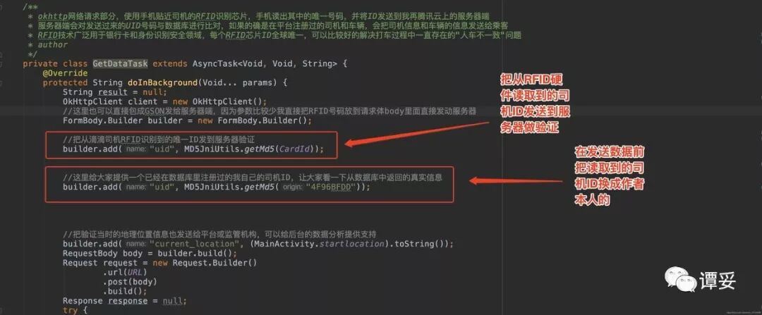 服务器端用的是我自己的腾讯云主机 + Apache + PHP+ MySQL , 会一直开放出这个项目的网络接口并持续维护,方便读者测试这个功能。读者只要在验证环节使用手机读取任何一个嵌有RFID加密芯片比如学生证、银行卡、公交卡,程序在发送数据请求之前(下图代码中第二行高亮的部分)都会把读取到的ID信息换成作者本人的,再发送给平台服务器服务器做验证,这样读者测试时使用手机读取任何RFID信息都会接收到从服务器发回来的司机信息。实际项目中把这一行注释掉即可。