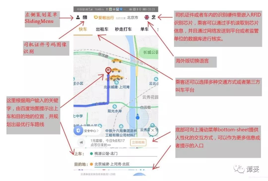 主界面的下方可以提供上划菜单,主要用于上车和目的地地址关键字输入,以及安全提示信息或者广告的入口。