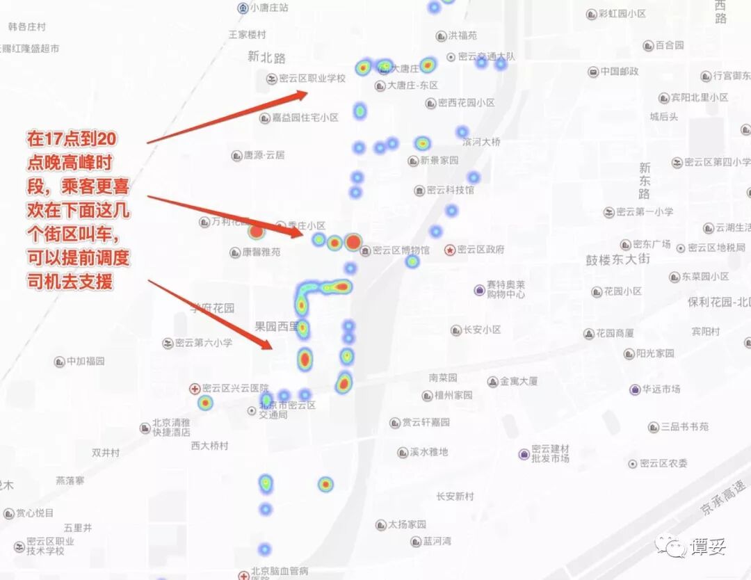 还可以根据乘客的叫车时间,筛选出高峰时段的用车需求热力图,给司机调度部门提供数据支持。