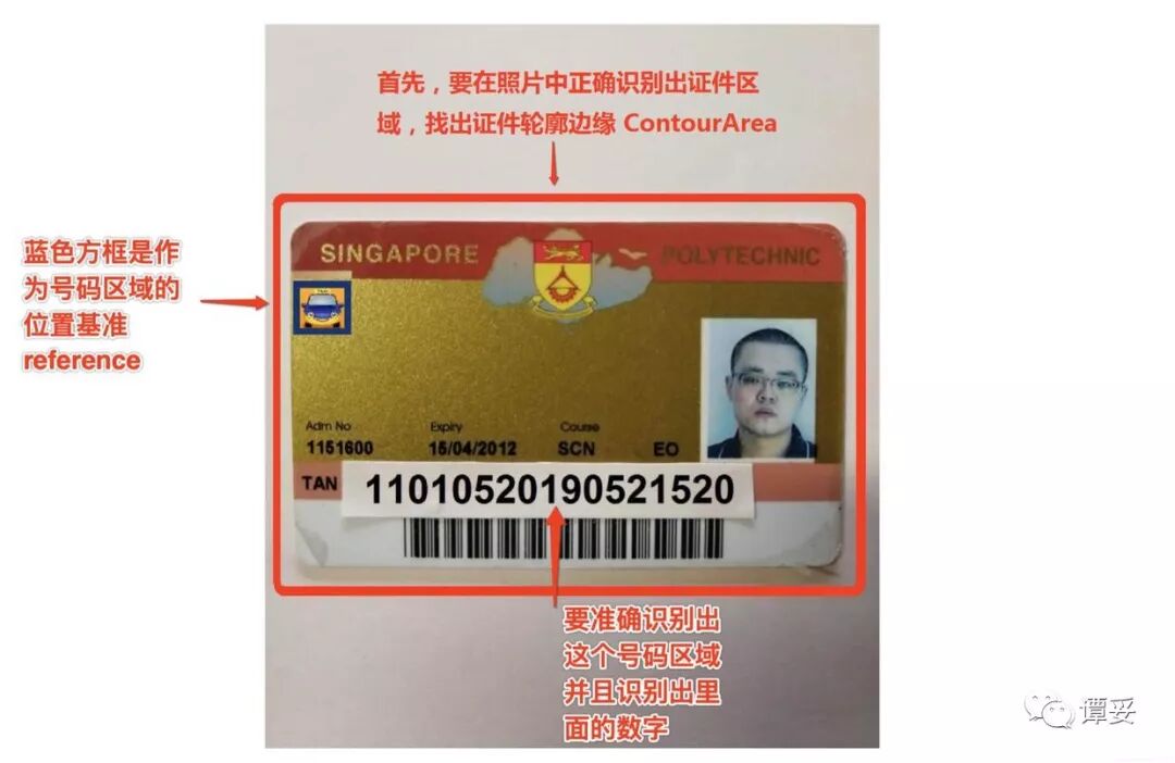 //下面对二值化图像进行形态学的开操作(morphology excution),去除小的 5*5大小的结构元素(噪声) Mat kernel = Imgproc.getStructuringElement(Imgproc.MORPH_RECT, new Size(5, 5)); Imgproc.morphologyEx(binary, binary, Imgproc.MORPH_OPEN, kernel);//去除噪声噪声处理以后开始寻找证件区域内的号码区域 Contour做轮廓发现操作: //对每个ROI寻找外接矩形 contourArea for (int i = 0; i < contours.size(); i++) { Rect roi = Imgproc.boundingRect(contours.get(i)); //对于识别出来的矩形区域如果太小(面积小于200像素)则忽略 if (Imgproc.contourArea(contours.get(i)) < 200) { continue; } //找到标志区域以后,以标志区域为基准,证件号码的位置在标志x坐标 *2 左右,宽度大概在 binary.cols() - roi.x - 100像素 //证件号码的高度大概是证件标志(基准)的0.7倍 height*0.7 ; //如果找到的左上角标志物的轮廓长宽都小于证件的三分之一,则以此标志物作为标准定为号码区域 if (roi.x < offsetx && roi.y < offsety) { numberROI.x = 3* roi.x + 120; numberROI.y = roi.y + 4 * roi.height - 65; numberROI.width = binary.cols() - roi.x - 390; numberROI.height = (int) (roi.height * 0.9); break; } }