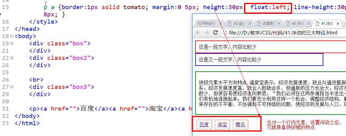 - 浮动初衷是为了实现字围(新闻),后面才发现,浮动可以让多个男标签并排显示。