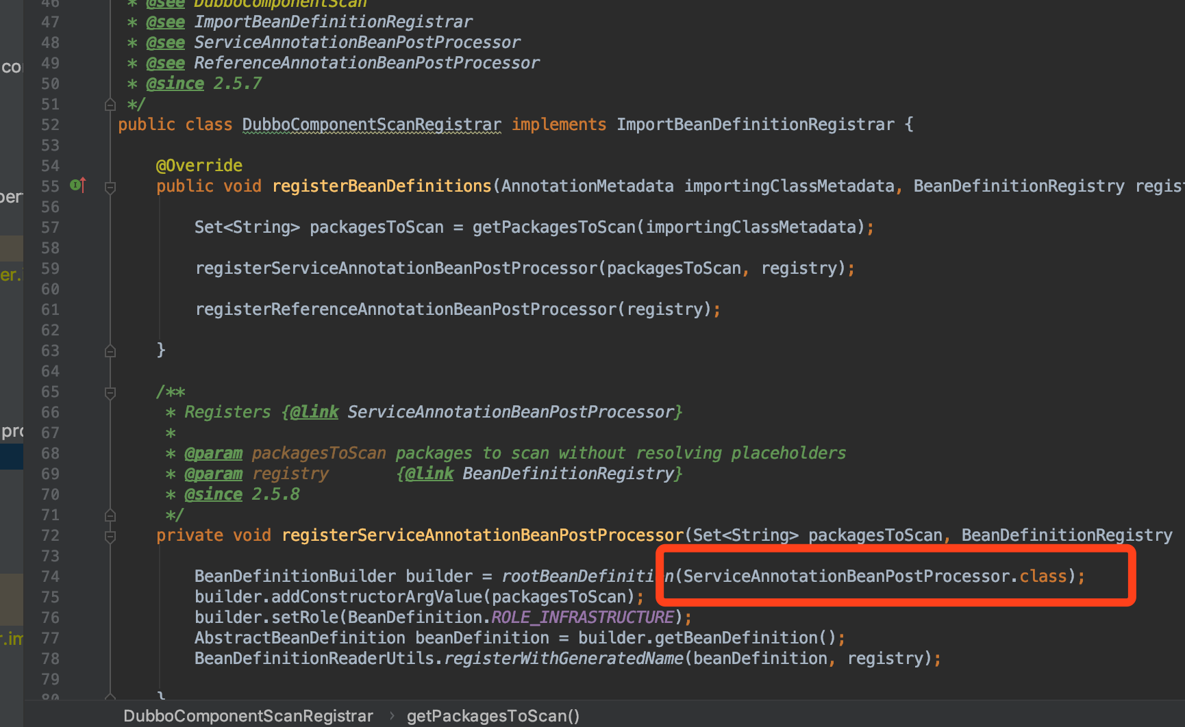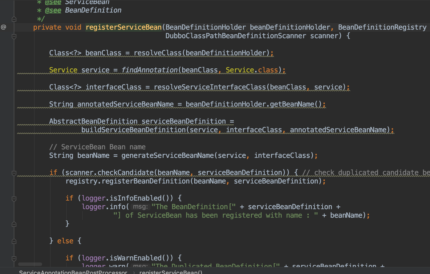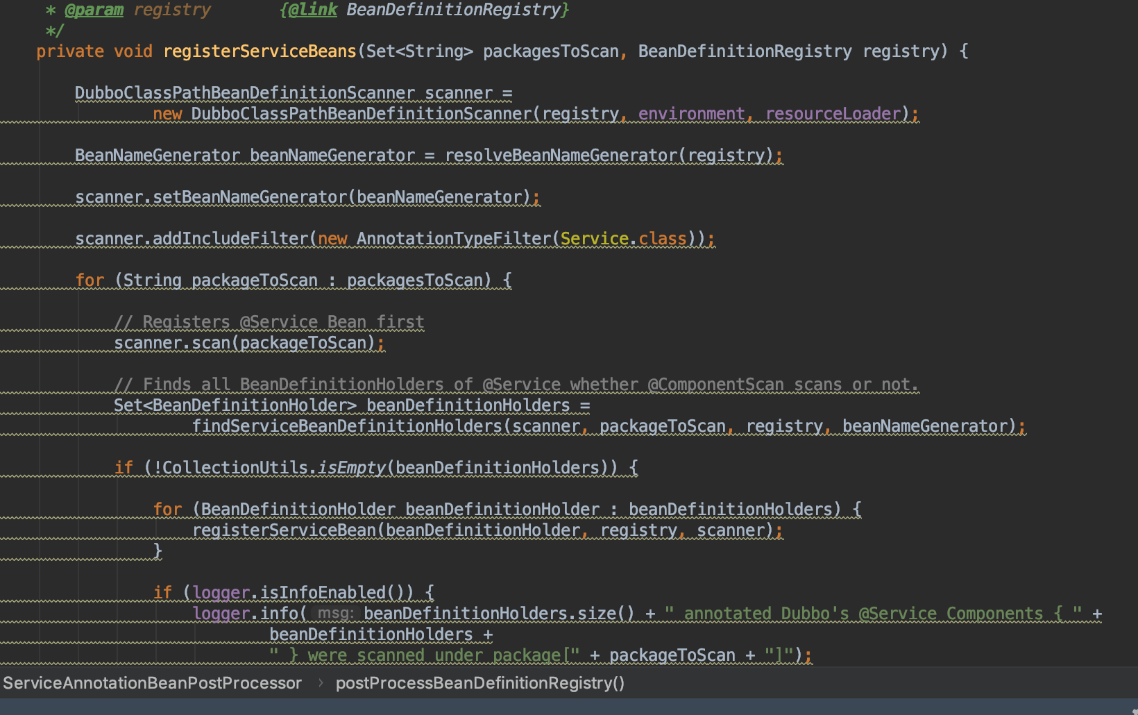 registerServiceBeans方法,首先是通过DubboClassPathBeanDefinitionScanner扫描包路径的过滤所有含有@Servcie注解的Bean,然后注到BeanDefinitionRegistry实例总