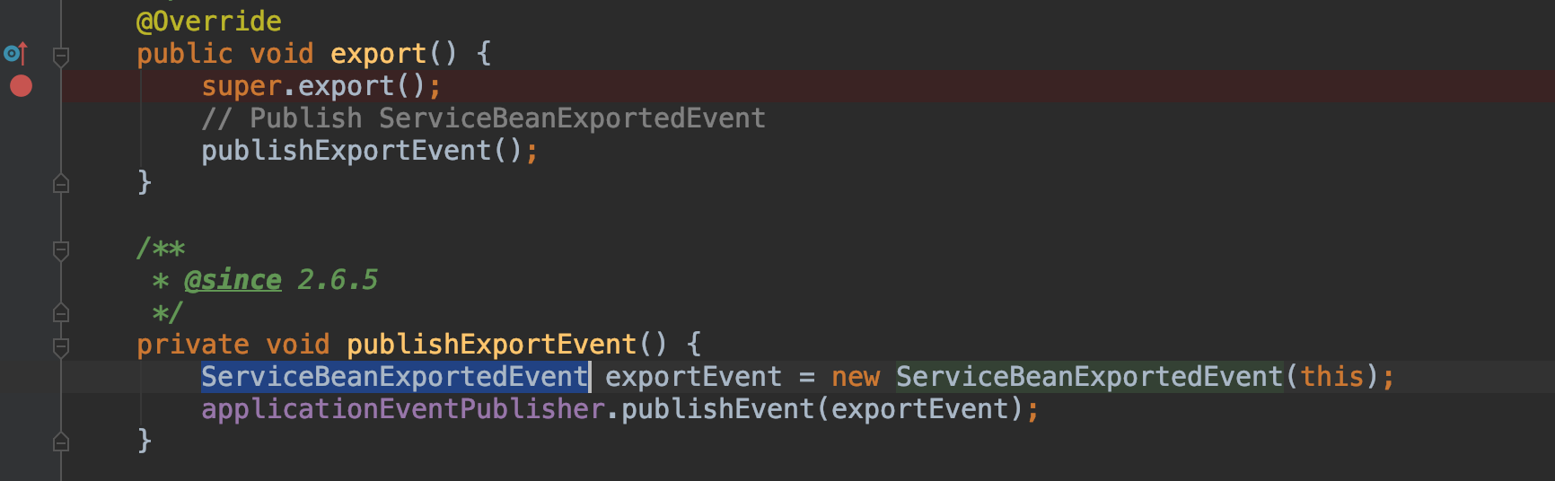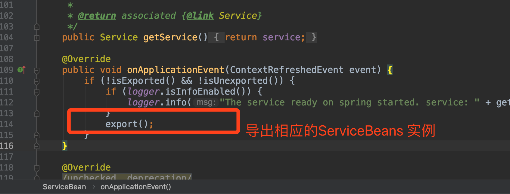 首先Service自身是实现ApplicationListener接口,监听ContextRefreshedEvent事件,也是ApplicationContext启动完成后,开始执行export.