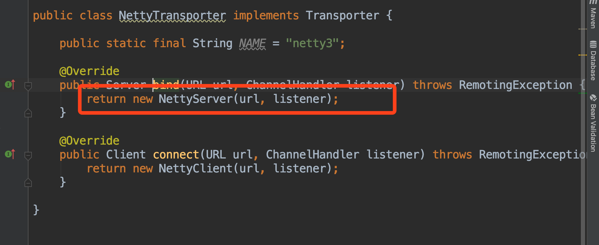 这里可以看到ExchangeServer同时绑定Transporter的实例对象,它的通过SPI动态加载的,默认是NettyTransporter, 使用Netty作为