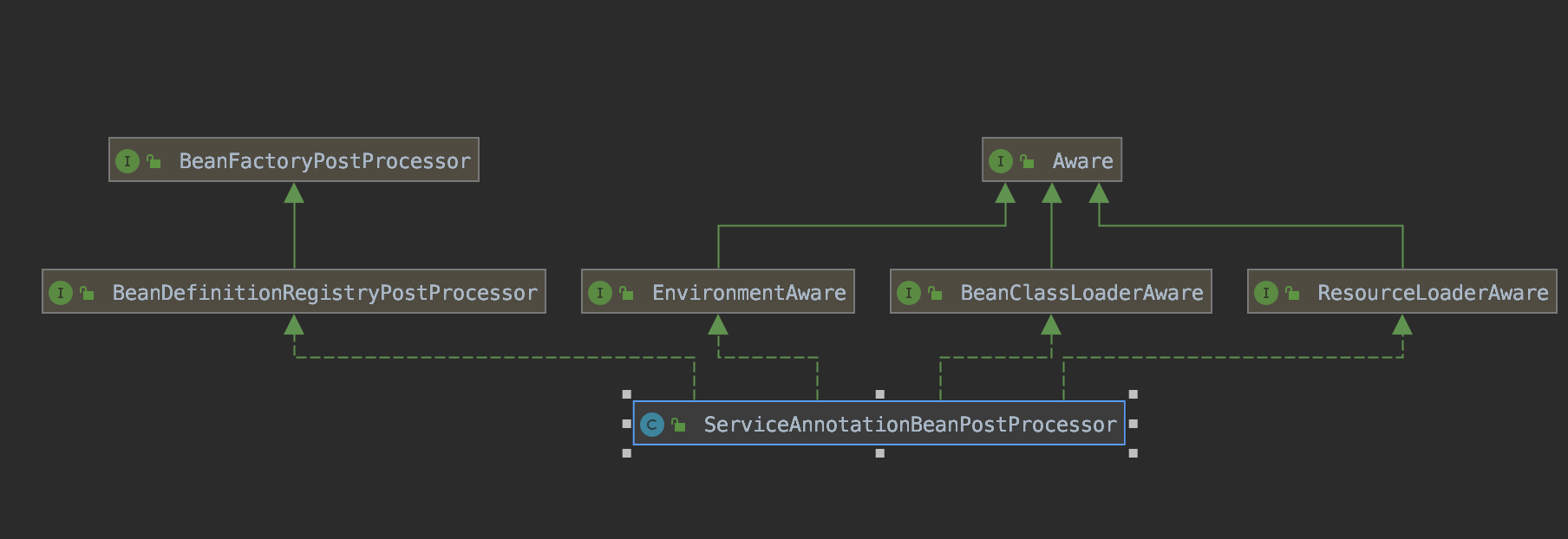 这里可以看到ServiceAnnotationBeanPostProcessor实现了BeanDefinitionRegistryPostProcessor接口的方法,postProcessBeanDefinitionRegistry方法传入BeanDefinitionRegistry实例,该方法是将ServiceBean的BeanDefinition注册到BeanDefinitiond到BeanDefinitionRegistry实例中.