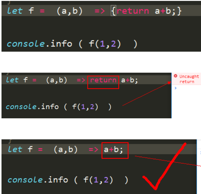 - 且如果只有一句函数体,而且他是return语句,则{}可省,return也可以省。