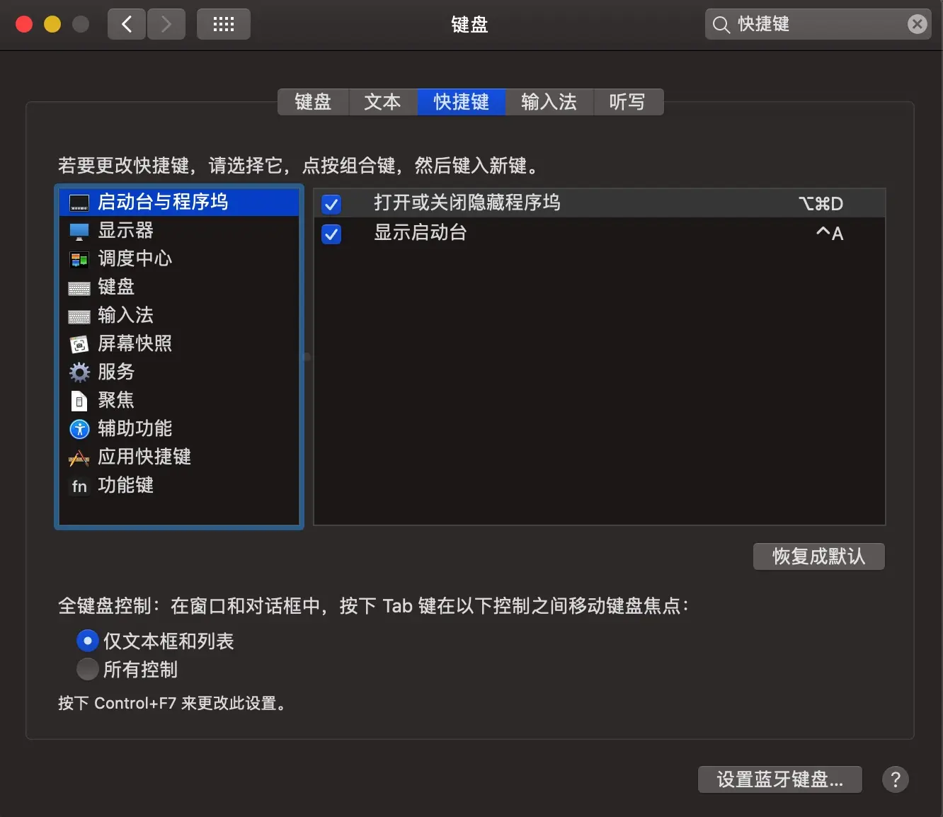 当然除了Mac预设的既定快捷键之外,我们也可以自定义快捷键,比如我更多使用键盘操作电脑的,但是每次打开Mac的启动台都要用鼠标去点,然后我就打开了快捷键设置界面将Command+A设置成了打开启动台的快捷键。