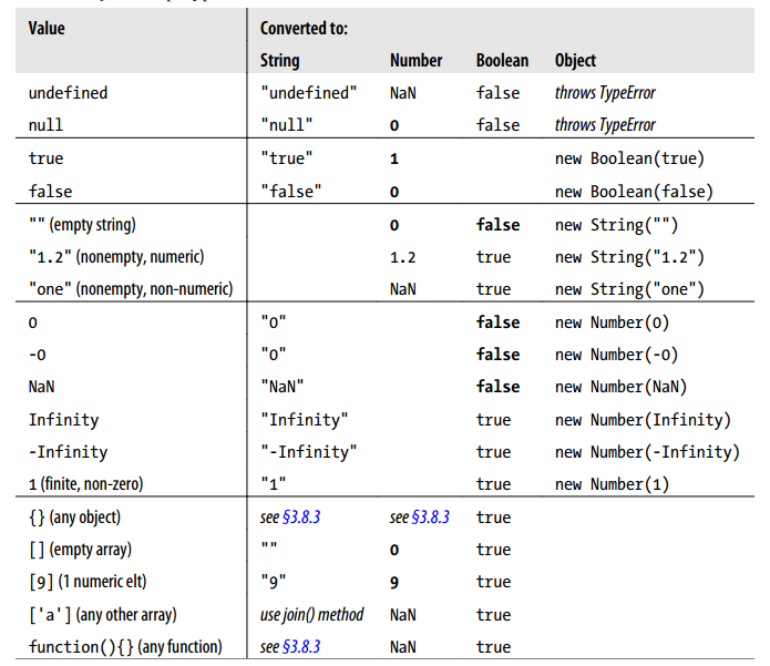 - 空数组被转换为数字0,具有单个元素的数组会转换成一个数字。数组继承了默认的valueOf方法,返回一个对象而不是原始值,所以数组到数字的转换则调用toString方法。