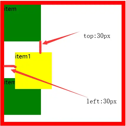 - 能够让元素偏离它在标准流中的位置。正常情况下,item2应该出现在红色框所示的区域(就是默认位置。)