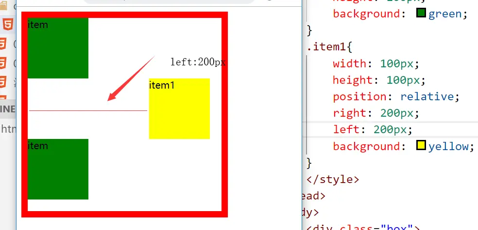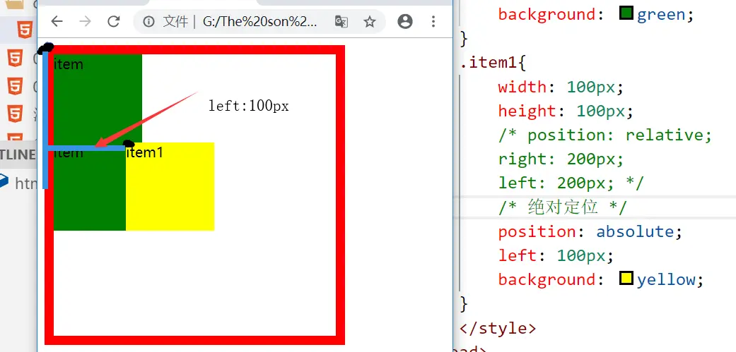 - 上面的代码中,绝对定位元素item1的参考元素是body,所以left是相对于body元素的原点(左上角)来设置的。