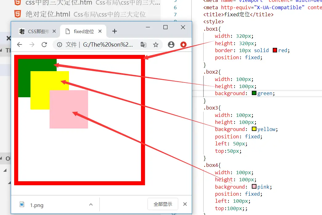 - 与绝对定位类似,但比绝对定位要简单:不需要去确定参考元素。所有固定定位的元素的参考元素都是整个页面。