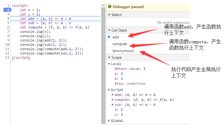 - 调用函数 add() 产生一个add函数执行上下文。这个执行上下文会放在 compute函数执行上下文上面。