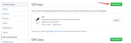 2)找到Personal settings的SSH AND GPG KEYS一栏,点击New SSH key。