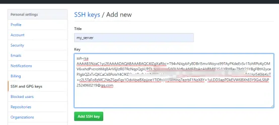 3)将刚刚在服务器生成的ssh字符串复制黏贴进文本框,点击Add SSH key即可,如图3所示。