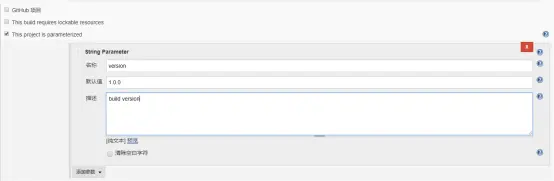 string (name:'version',defaultValue:'1.0.0',description:'build version')