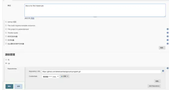 4)填入描述与git仓库地址和Credentials,如图所示。