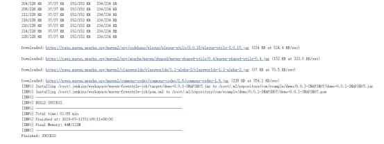 8)点击左下角的小圆圈可以看见控制台的日志输出,可以查看构建已经成功。生成的Jar包可以在/root/.jenkins/workspace/maven-freestyle-job/target中查看。如图所示。