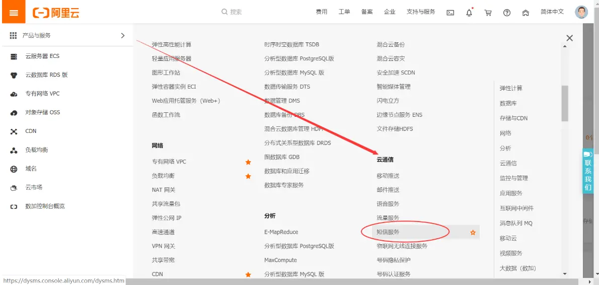 打开阿里云的控制台,在产品与服务中找到云通讯,并选择短信服务