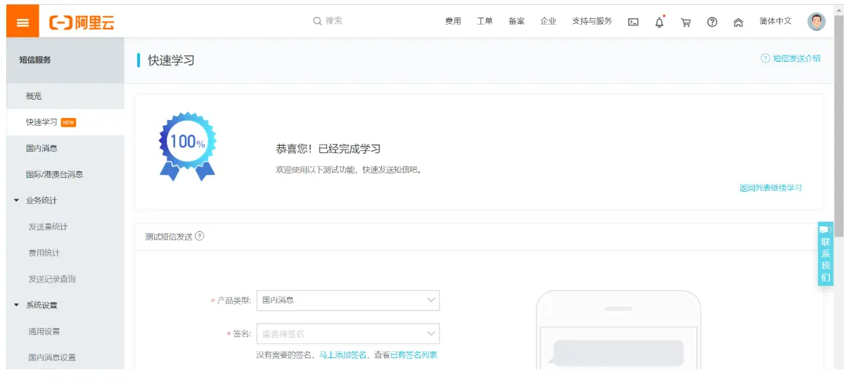 然后会有一个新手接入的教程,这边直接跟着快速学习了解一下短信服务的基本流程,快速学习下面有短信测试的Demo,可以尝试一下,前提是得再阿里云里有余额,本地每条短信0.04元已近很良心价了呢
