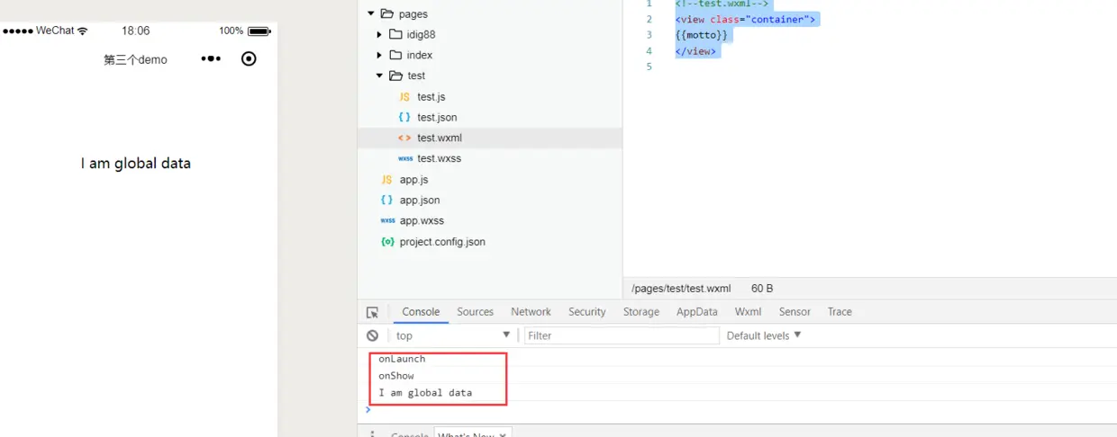 >test.js 和 test.wxml ,test.js先初始化获取全局实例,通过全局实例获取到全局变量,将全局变量赋值给页面数据上motto上。test.wxml是通过数据绑定的方式获取motto的值。