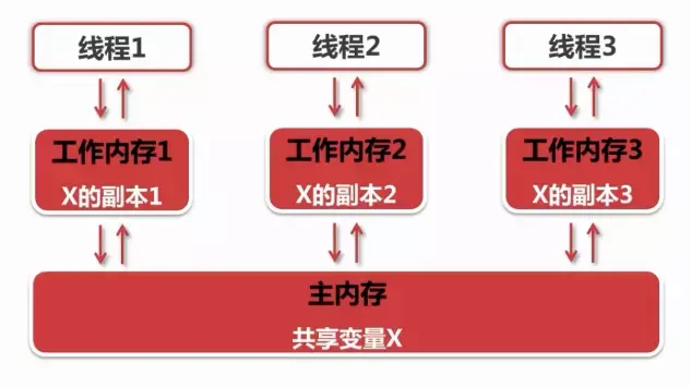 上图便是多线程工作的的执行流程,每个线程都可以主内存中的共享变量X进行更改操作,但是线程不能直接对主内存中的共享变量进行访问 都有自己的工作内存,如果线程想要对主内存中的X进行操作,需要先将该变量拷贝至线程自己的工作内存中一份,然后在本地进行更改操作之后,再将最终的结果同步至主内存中。