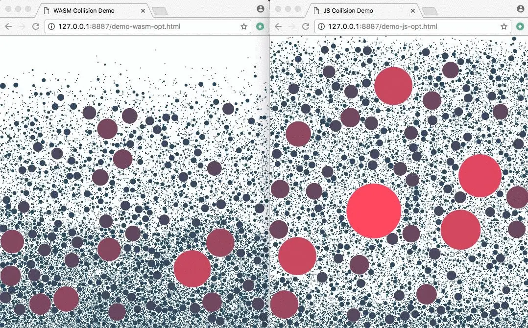 让我们再用个动图直观感受下WebAssembly与JavaScript的运行速度,相比之下WebAssembly确实快很多。如果想自己跑跑看或是看源码的开发者,可以移驾 Guy Bedford 的repo - Wasm Demo。