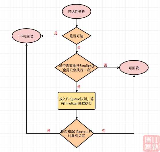 如图所示,对象 Object 5、Object 6、Object 7 虽然互相有关联,但是它们到 GC Roots 是不可达的,所以它们将会被暂定为是可回收的对象。但此时判定并没有完全结束,因为判定一个对象是否是可回收是需要经过两次标记过程的,上述是第一次的标记过程,第二次标记则是将第一次标记的对象进行一次筛选:通过判断该对象是否需要执行 finalize() 方法。如果该对象覆盖了 finalize() 方法,并且系统没有运行过该方法(finalize() 方法全局只运行一次),则表示该对象需要执行finalize() 方法,那么这个对象将会被放入到一个叫 F-Queue 的队列中,等待虚拟机中的一个低优先级的Finalizer 线程去执行它。在执行 finalize() 方法的过程中,只要该对象没有和 GC Roots 引用链上的任何一个对象有关联,这个对象才能被真正的定为是可回收的对象。