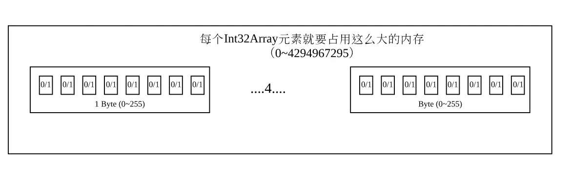 因为计算机最终是处理二进制0-1,所以我们要看看这个xxxArray是怎么存储的,比如Int32Array每个元素需要4Byte才能满足他的使用,因此需要在内存开辟4个slot,如图给她。