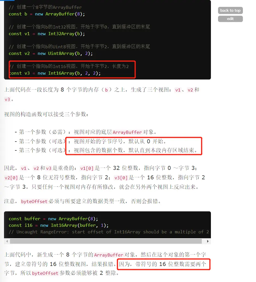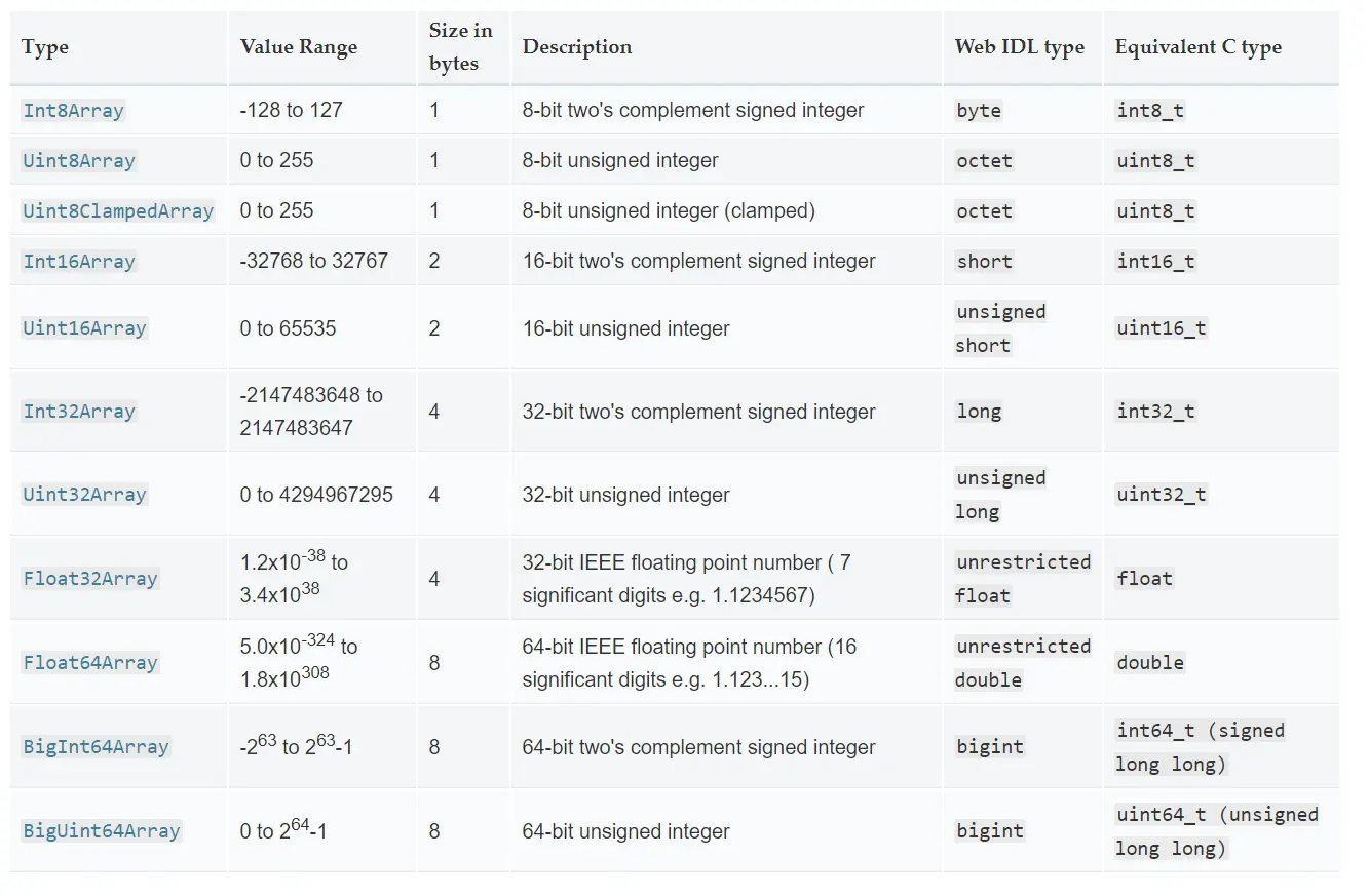 再比如Int32Array(没有Uint-unsigned)因此是signed(有+-号)的数字,32表示32bit,4byte,因此最大是:4294967295,即范围是(-2147483648 to 2147483647),也就是说每个元素的范围。