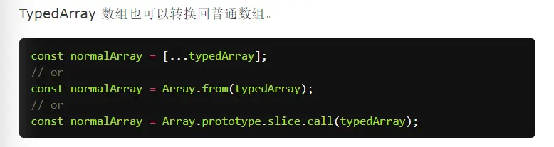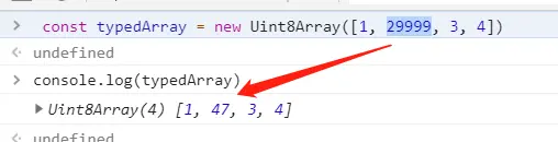 - const typedArray = new Uint8Array([1, 2, 3, 4]); 表示长度为4的数组,每个元素最大是255,因为只分配了1 Byte。