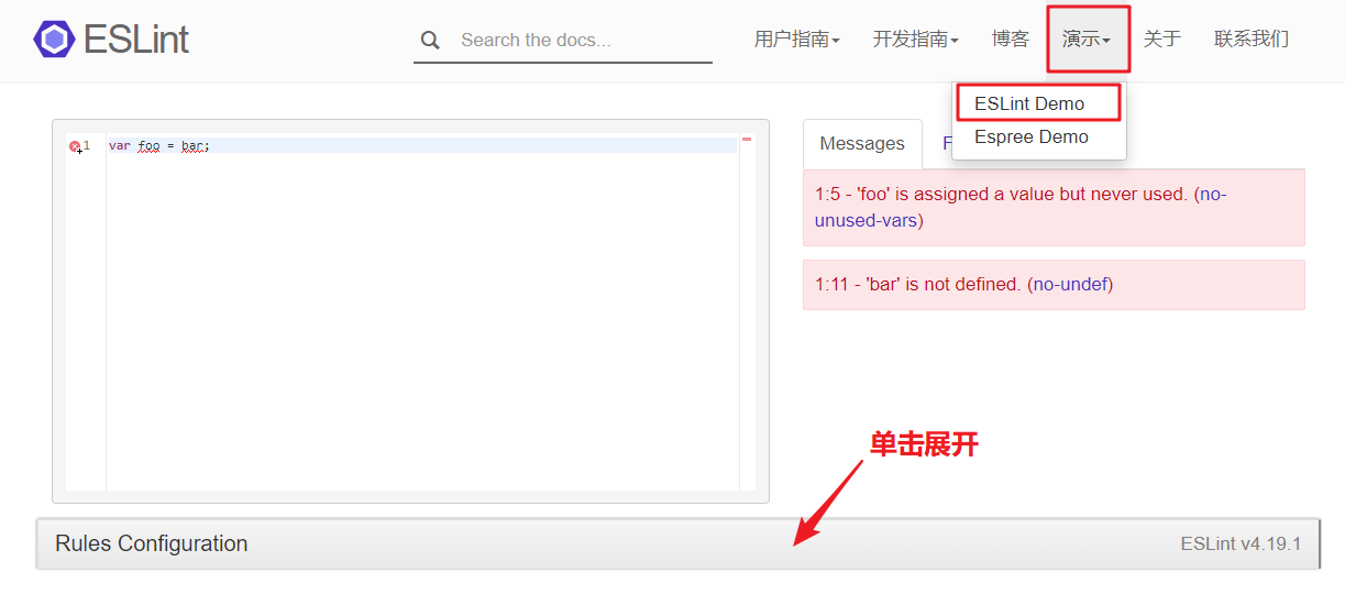 如果你对ESLint非常熟悉,那么完全可以自己动手编写该配置文件,但是大多数人可能对ESLint的配置不是那么熟悉,这里推荐大家到 官网的Demo配置页面 ,根据自己的需求,来获取ESLint配置文件: