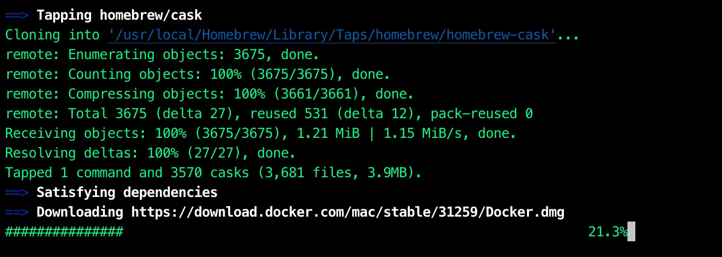 Homebrew 的 Cask 已经支持 Docker for Mac,因此可以很方便的使用 Homebrew Cask 来进行安装: