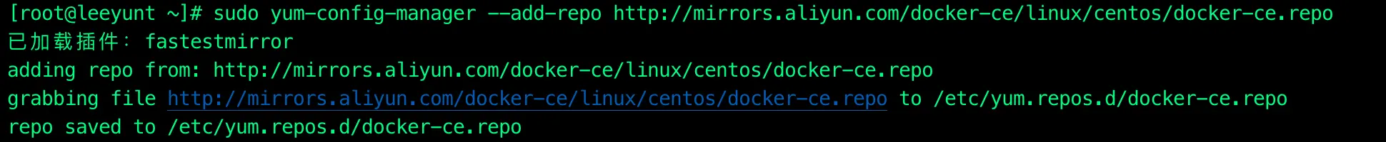 $ sudo yum-config-manager --add-repo http://mirrors.aliyun.com/docker-ce/linux/centos/docker-ce.repo