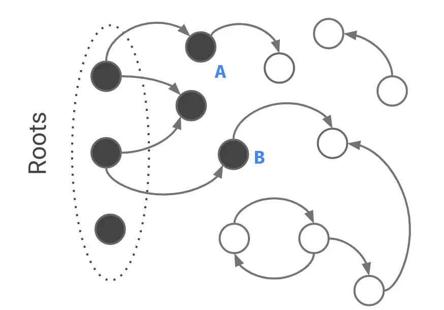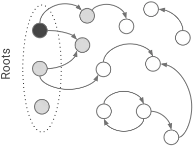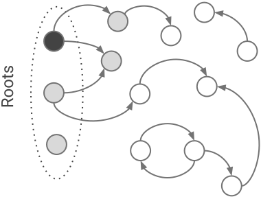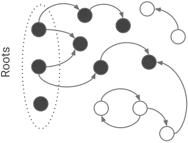 对于传统的算法而言,垃圾回收是『全暂停式』(Stop-The-World,后面简称 STW)的,当程序(专业术语称 mutator,指能改变这个内存区域是否被程序引用的东西,比如程序本身。顺带一提,这个词儿也是 Dijkstra 琢磨出来的)执行,GC 等着;特定时机时(比如内存满了)GC 执行,mutator 等着。因此它的如何找和何时找都比较简单:内存满,STW 开始;而找垃圾就是一种图的遍历,从 Root 出发,对所有能访问的节点进行标记,访问不到的就是垃圾。