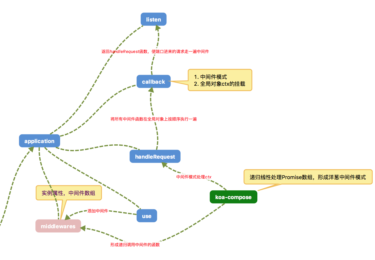 这是我们引入koa的模块来写的代码,可以清楚的看到koa在里面做了哪些事情。这里需要注意的是app.use注册中间件的操作,首先我们来了解一下中间件是如何执行的。