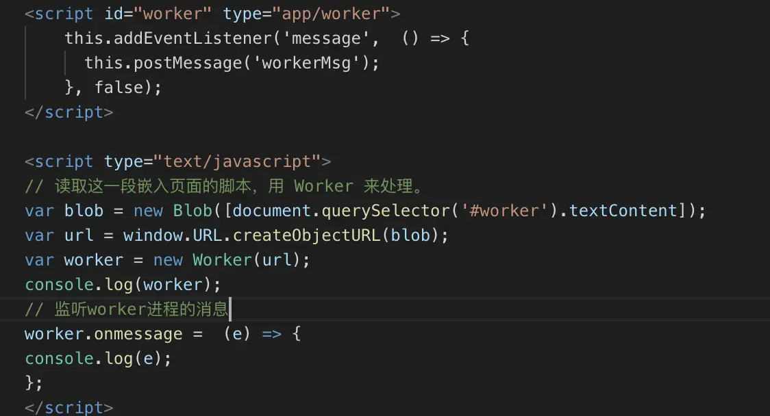 var worker = new Worker('work.js');原因在于chrome不允许通过本地文件访问使用Web Worker,所以需要部署在localhost或者服务器上。所以我们直接在页面内部嵌入Worker。将内嵌Worker转成一个二进制对象,将二进制对象生成url,让Worker加载url。Worker进程传输一个字符串‘workerMsg’给主进程。