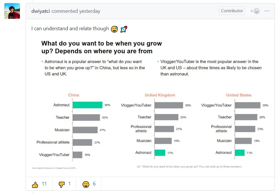 该项目的 contributor 之一 dwiyatci 认为出现这么多中文 issue 说明中国人更关注航天领域。他举出了一个调查结果,显示中国年轻人最想成为宇航员,而欧美青年最想成为网红,言下之意中国科教兴国是主流,欧美则反智横行。这与很多中国人的刻板结论恰好完全相反。