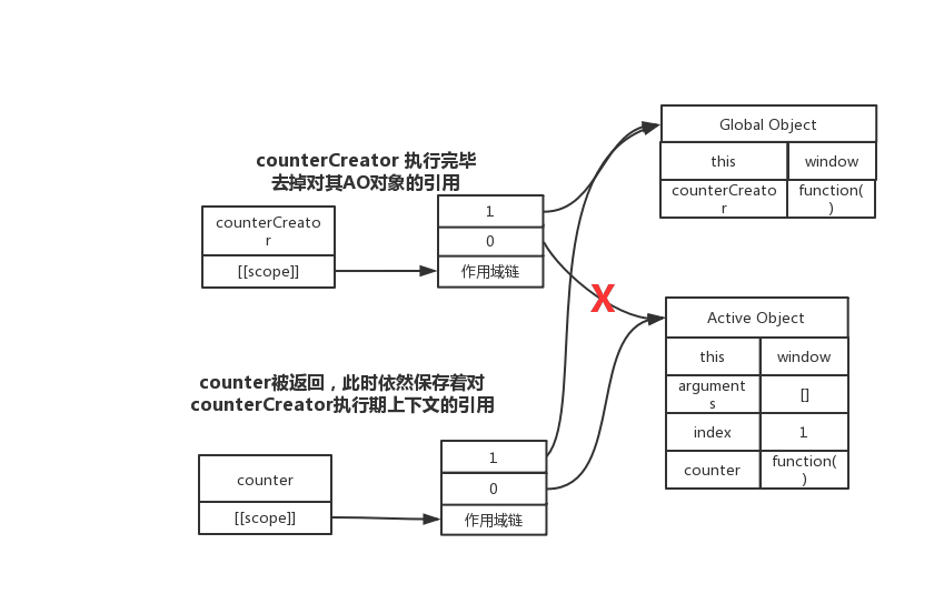 而上面这两句代码很重要,它其实是把闭包函数赋值给了一个变量,这个变量是一个活对象,这活对象引用了闭包函数,闭包函数又引用了AO对象,所以这个时候AO对象也是一个活对象。此时闭包函数的作用域链得以保存,不会被垃圾回收机制所回收。