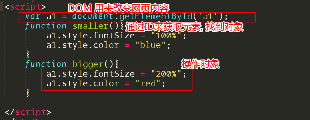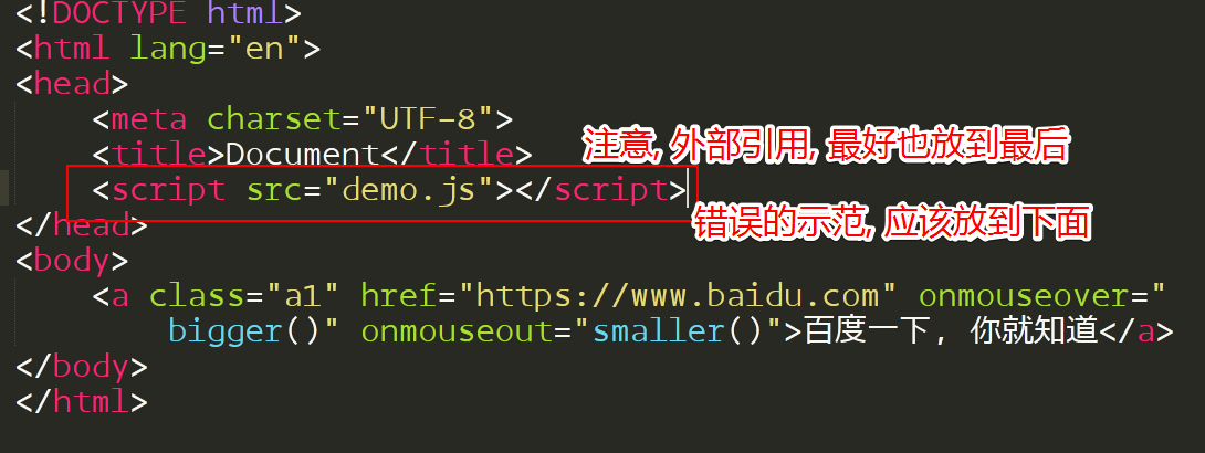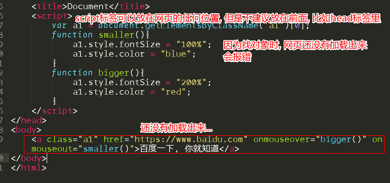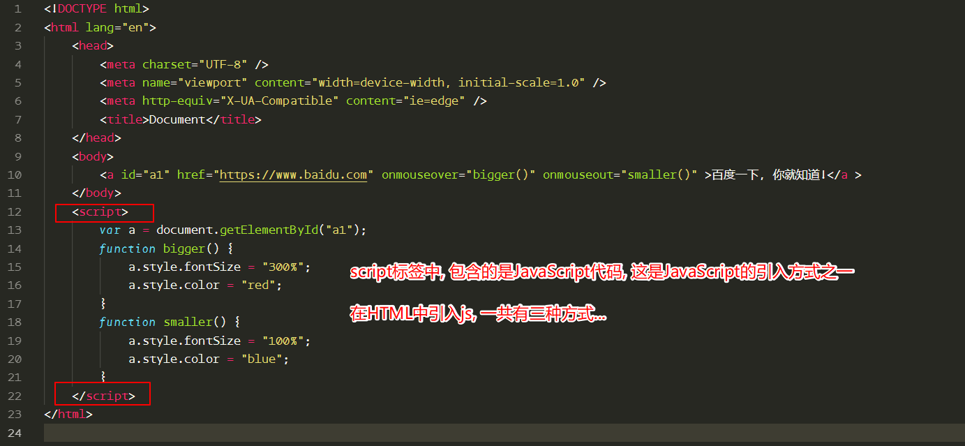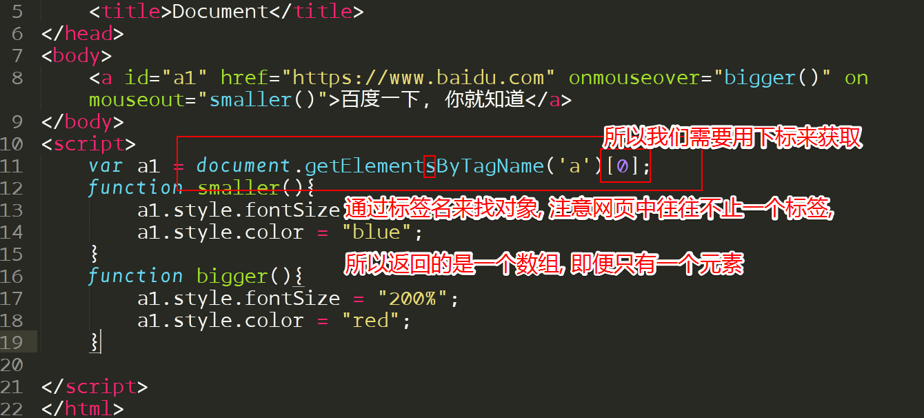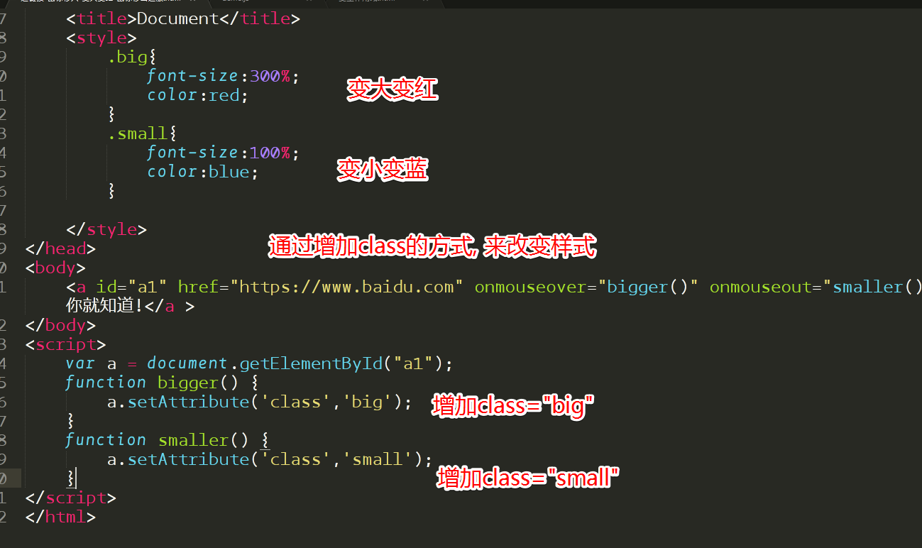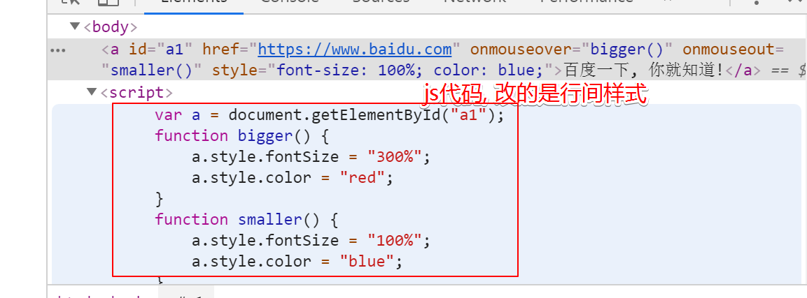 <a id="a1" href="https://www.baidu.com" onmouseover="bigger()" onmouseout="smaller()" >百度一下, 你就知道!</a >
