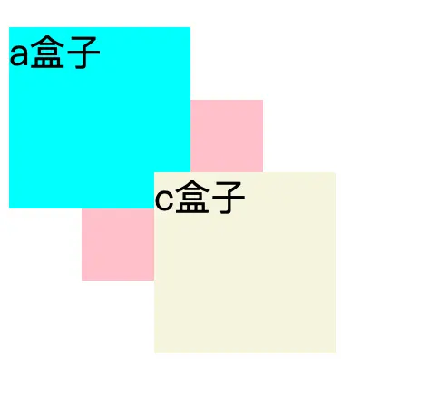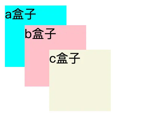 按上面代码,此时 a、b、c 三个盒子都发生了定位,但是它们的父盒子都没形成层叠式上下文,因此会按照文档流的顺序发生层叠,结果如下图: