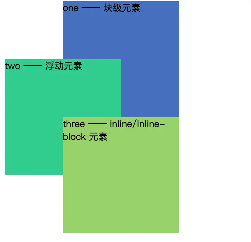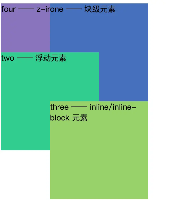 这时候,三个盒子自身都形成了层叠式上下文,但是它们的父盒子依旧没有形成层叠式上下文,所以它们是同属于一个层叠式上下文中,也就是根级,这时候它们的排列会按照各自的层叠等级进行排列,也就是 z-index 值大的在上面如下图所示: