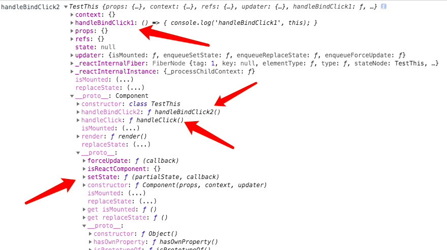 handleClick没有绑定 this,打印undefined,原因是 handleClick 是以赋值的方式被赋予 onClick,所以默认的 this 会失效,类似于display = foo.display; display();this 不是 foohandleBindClick1用箭头函数绑定 this,而且它的 this,不会被变更,打印了 TestThishandleBindClick2,用 bind(this) 绑定上下文,打印了 TestThis